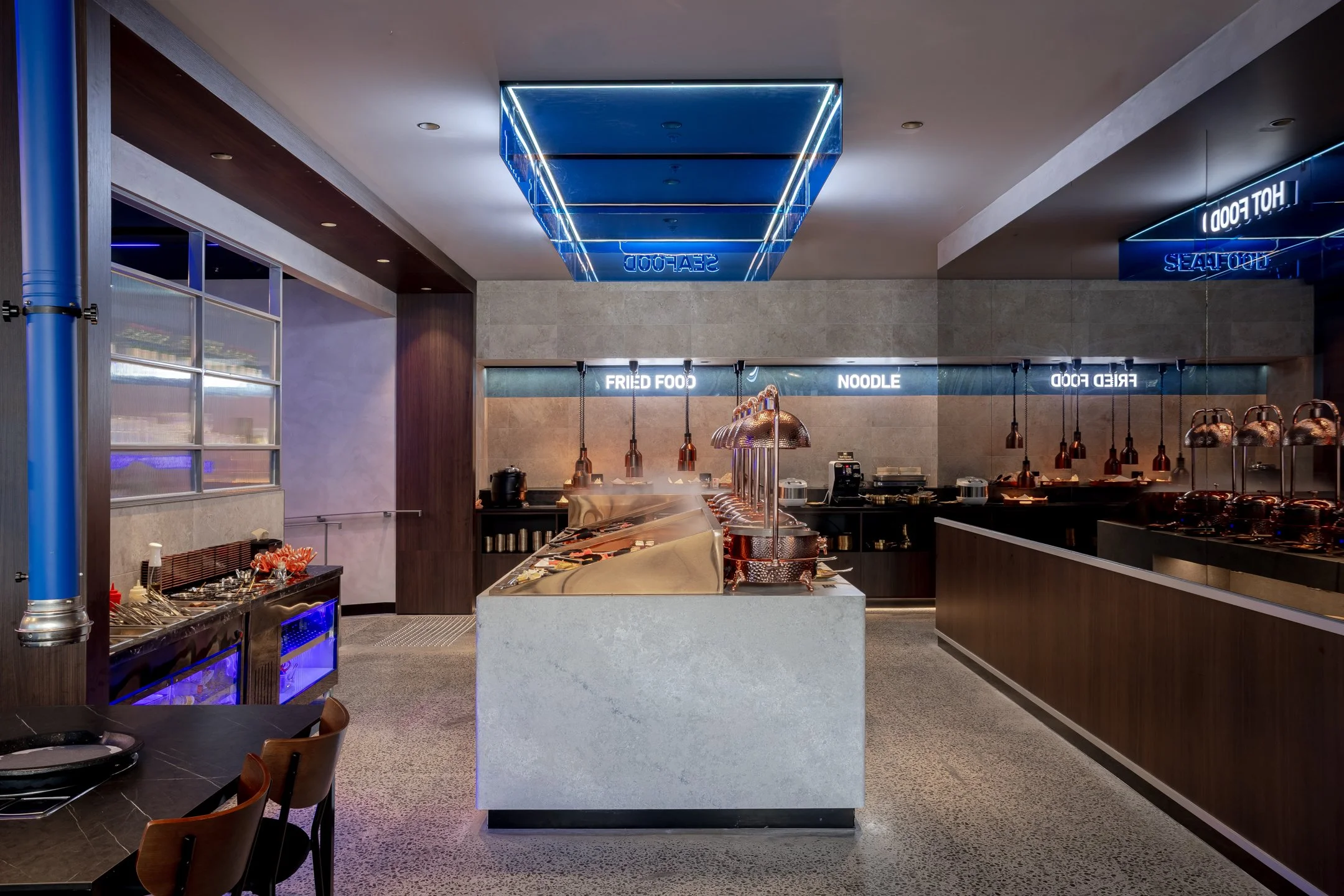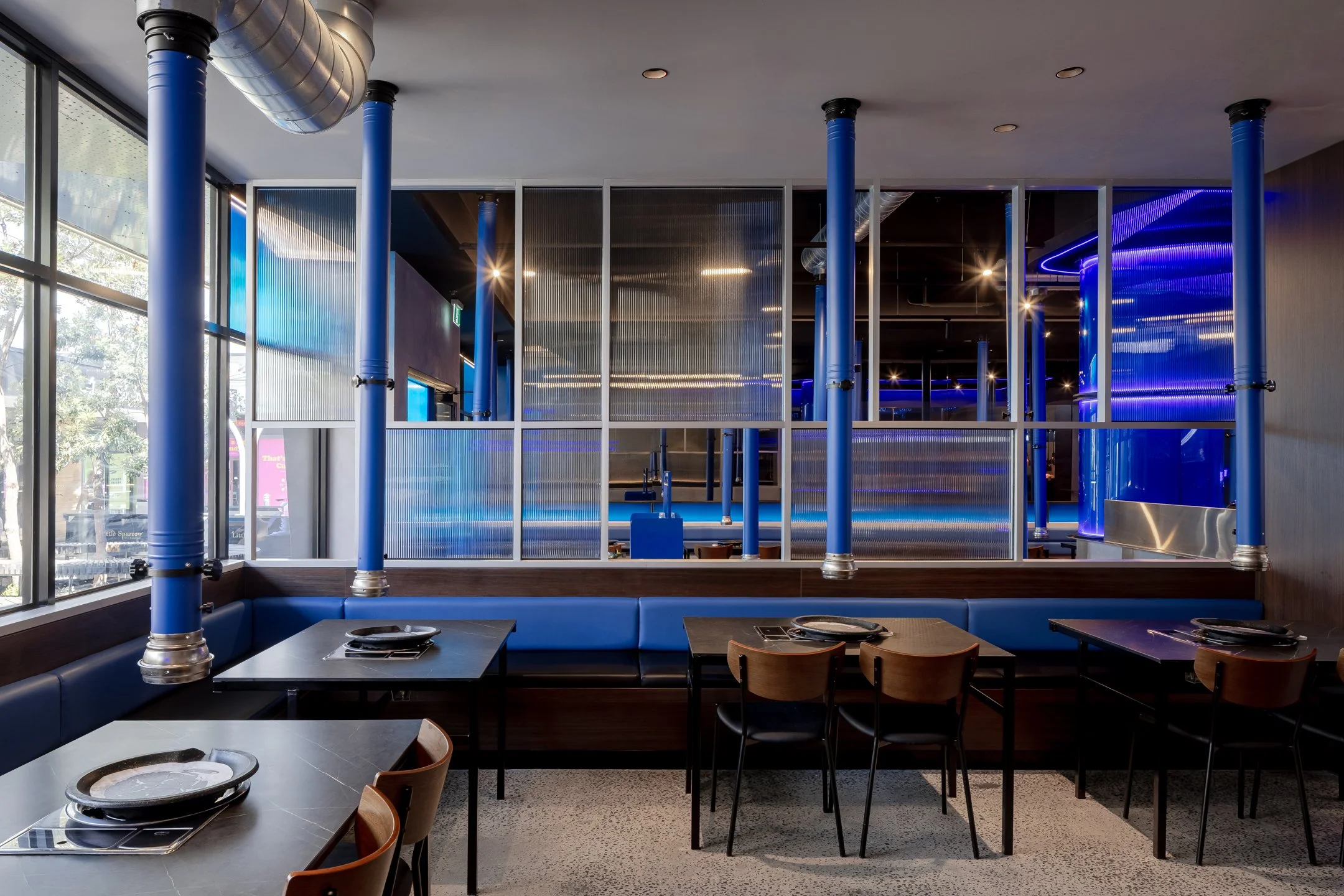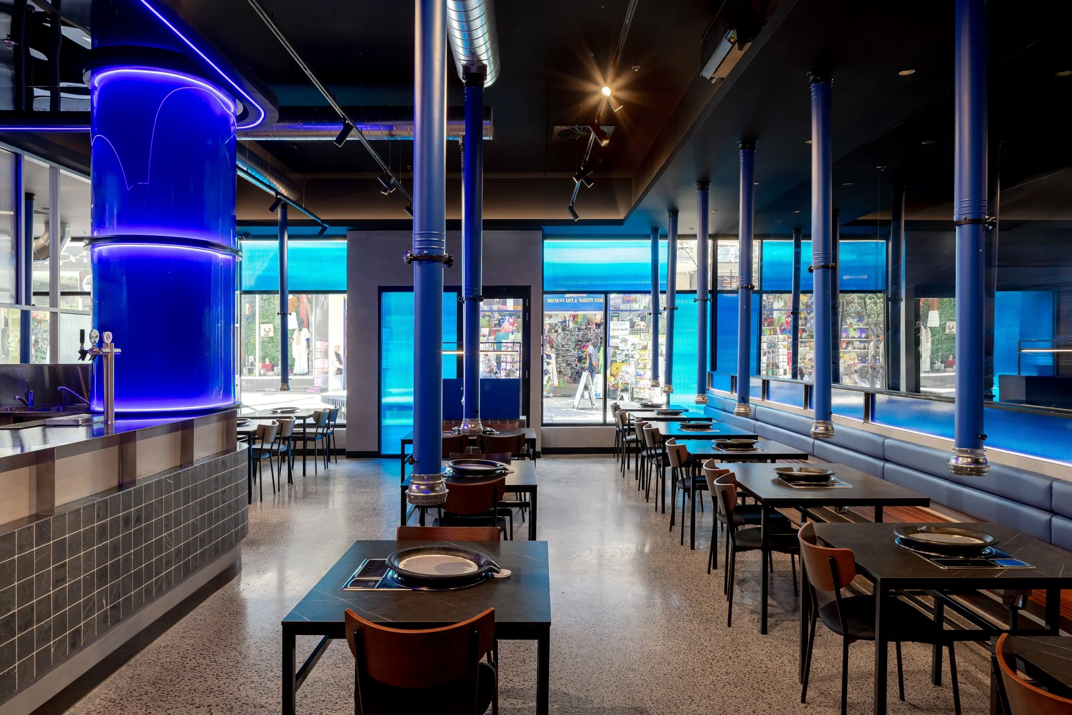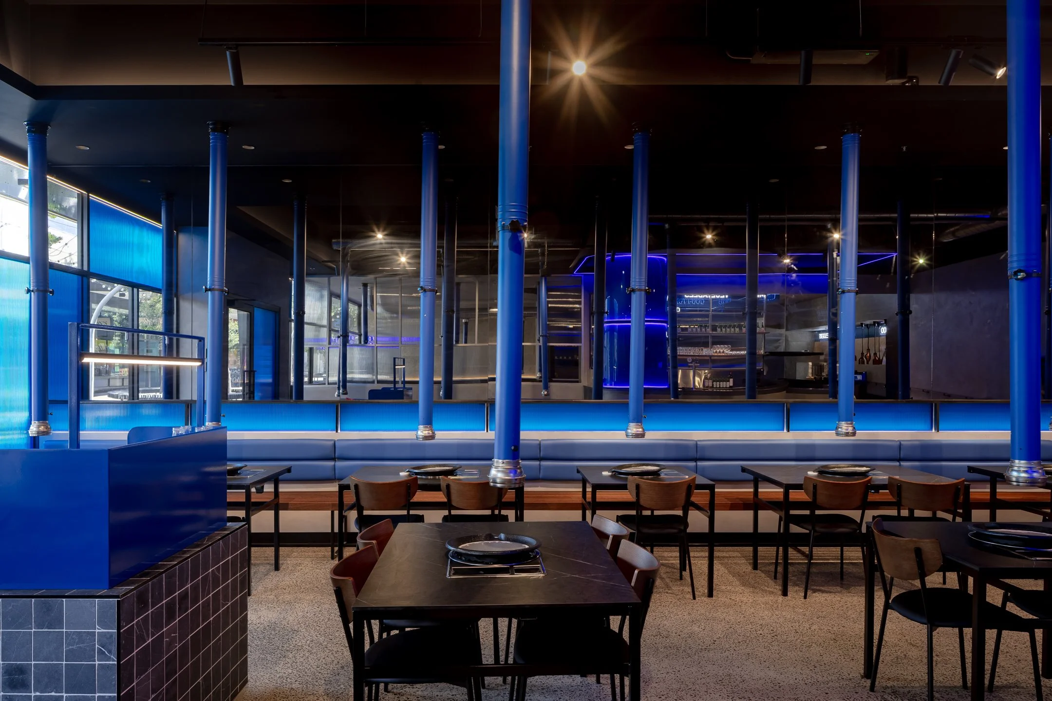 Material selection was central to shaping the tone and authenticity of the space. The brand’s signature blue continues to anchor the interior, used with restraint and intent to guide movement, reinforce identity, and reference flame, heat, and the act of cooking.