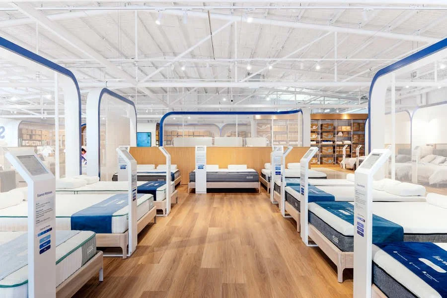 The space unfolds like a physicalised scroll. From the moment you step through the doors, sightlines and circulation encourage exploration. Hero mattresses take centre stage, while furniture and lifestyle products are positioned in zones that feel like natural progressions, not just displays, but small “stage sets” where each product comes to life.